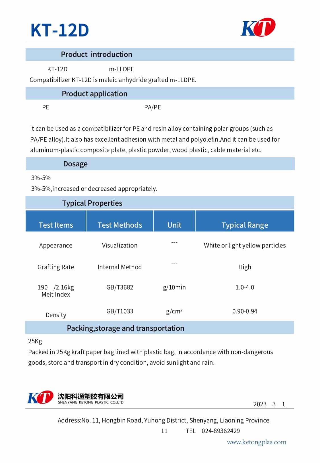 • Compatibilizer KT-12D: Bridging Polymers and MetalsIntroducing Compatibilizer KT-12D, our innovative maleic anhydride grafted m-LLDPE (metallocene Linear Low-Density Polyethylene) product. KT-12D is engineered to act as a powerful compatibilizer in diverse industrial applications, particularly in bridging polyethylene (PE) with polar group-containing resins like PA/PE compounds.